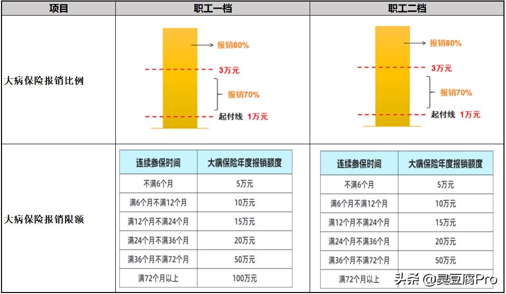 从上表可见,一档与二档完全一致,连续参保时间同样对报销限额有着重要影响。