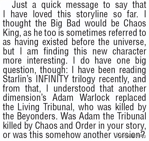 这里得说一下,从2014年的《灭霸年刊》开始,《灭霸:无限启示录》、《灭霸大战浩克》、《灭霸:无限相对论》、《无限实体》、《灭霸:无限结局》、、《银河护卫队:熵母》、《灭霸:无限同胞》、《灭霸:无限冲突》,到2019年的《灭霸:无限终结》组成了吉姆.斯大林的《无限传奇》。关于《无限传奇》,吉姆斯大林都是按照主宇宙来写的,但是由于吉姆斯大林对灭霸的刻画并没有得到漫威的认可,以至于二者爆发矛盾,漫威并不认可《无限同胞》、《无限冲突》和《无限终结》三部图像小说为主宇宙作品,吉姆斯大林也放飞自我,将AAO描写被灭霸击败并取代。