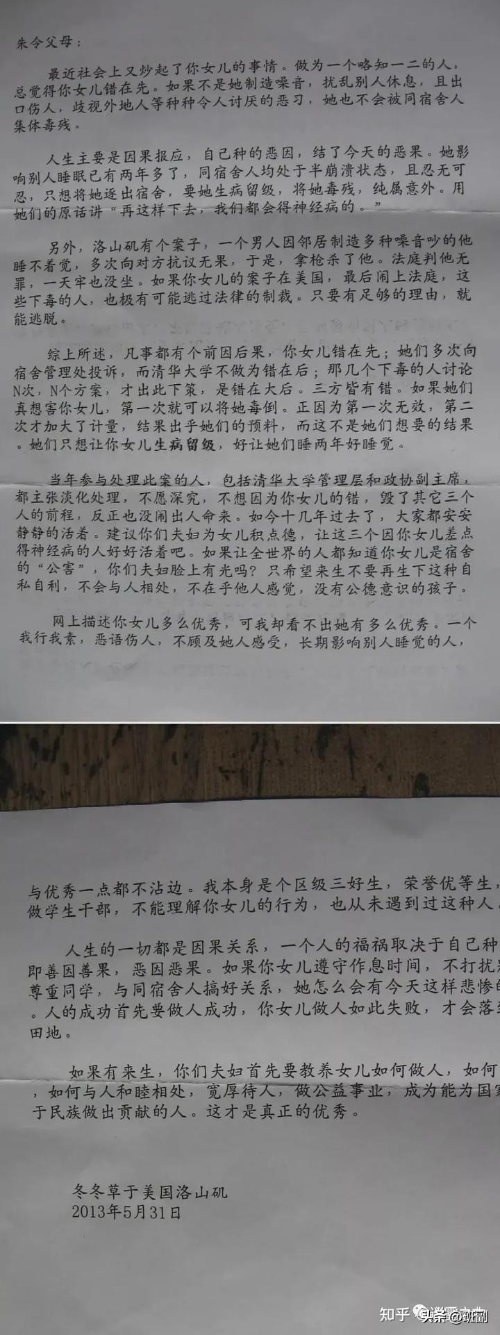 信中“2013年6月底,朱令家人收到一封写自美国洛杉矶、寄自拉斯维加斯的信件”,写信人“冬冬草”质问朱令的父母如何教育儿女真正的“优秀”,如果不是朱令影响别人休息,“也不会被同宿舍人集体毒残”。信中写到,“她影响别人睡眠已有两年多了,同宿舍人均处于半崩溃状态,且忍无可忍,只想将她逐出宿舍,要她生病留级,将她毒残,纯属意外。”
