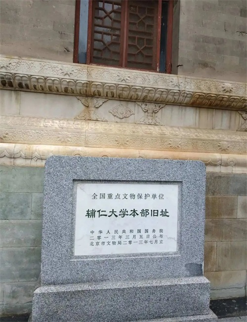 校址原为涛贝勒府 ,以府邸为校舍。后在府邸花园南部和马圈旧址建造辅仁大学新楼,汉白玉拱门、绿琉璃屋顶、灰砖石外立面,中西合璧式风格。1952年辅仁大学併入北京师範大学,现为北京师範大学继续教育学院。现在其遗址在后海一带,规模并不大,可进入校区后花园散步。