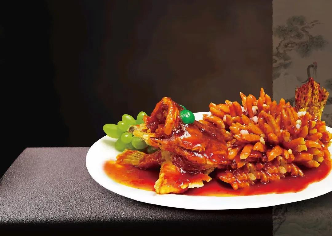 又名松鼠桂鱼,为苏帮菜中色香味兼具的代表之作,相传乾隆皇帝下江南,微服至苏州松鹤楼菜馆用膳,厨师用鲤鱼出骨,在鱼肉上刻花纹,加调味稍腌后,拖上蛋黄糊,入热油锅嫩炸成熟后,浇上熬热的糖醋卤汁,形状似鼠,外脆里嫩,酸甜可口,乾隆皇帝吃后很满意,后名扬苏州。