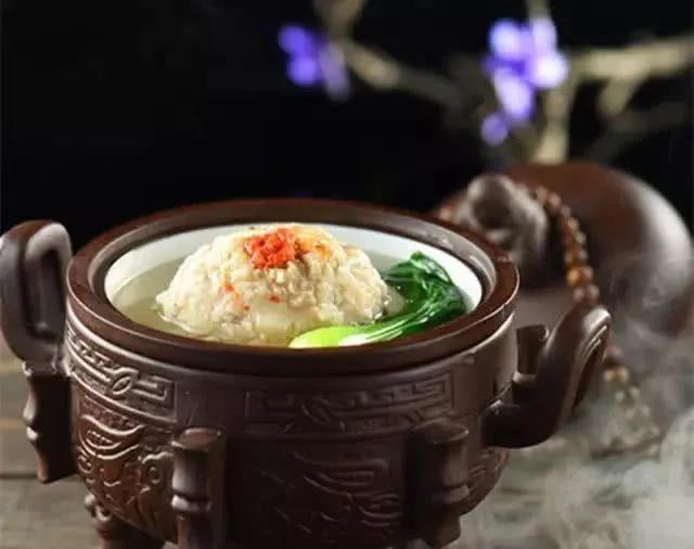 蟹粉狮子头”是久负盛名的扬州、镇江地区传统名菜。据传,此菜始于隋朝。当年,隋炀帝杨广来到扬州,饱览了扬州的万松山、金钱墩、葵花岗等名景之后,心里非常高兴,回到住处,仍然余兴未消。随即唤来御厨,让他们以扬州名景为题,做出几道菜来。御厨们费尽心思,终于做出了“金钱虾饼”和“葵花斩肉”这几道菜。杨广品尝后,十分高兴,于是赐宴群臣。一时间淮扬佳肴,倾倒朝野。到了唐代,一天,郇(xún)国公韦陟(zhì)宴客,府中的名厨也做了扬州的这几道名菜。当“葵花斩肉”这道菜端上来时,只见那用巨大的肉圆子做成的葵花心精美绝伦,有如雄狮之头。宾客们乘机劝酒道:郇国公半生戎马,战功彪炳,应佩狮子帅印。韦陟高兴地举杯一饮而尽,说:“为纪念今日盛会,葵花斩肉不如改为‘狮子头’。”从此扬州狮子头就流传镇江、扬州地区,成为淮扬名菜。
