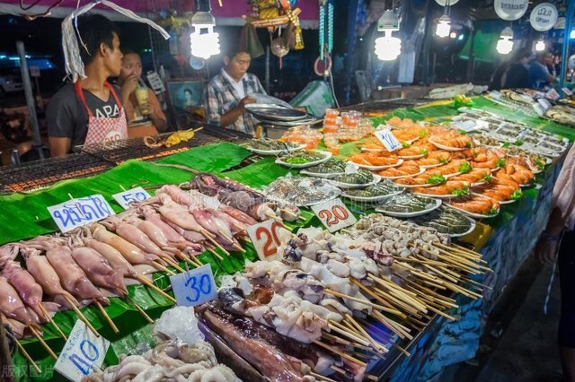 芭提雅夜市卖海鲜的街头小卖部Street food seller selling seafood
