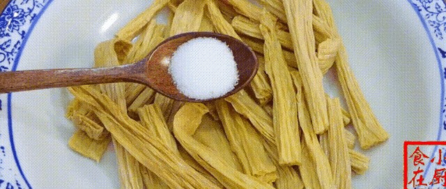 2. **加盐**:在温水中加入半小勺盐,搅拌均匀。盐的作用是帮助腐竹更好地吸水,并且能让泡发出来的腐竹更加柔软,避免中间有硬芯。
