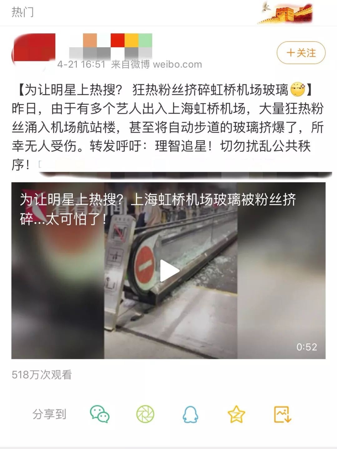 今年的4月20日,因有十几名艺人抵达虹桥机场,现场聚集了大批粉丝,上海虹桥机场玻璃被粉丝挤碎。