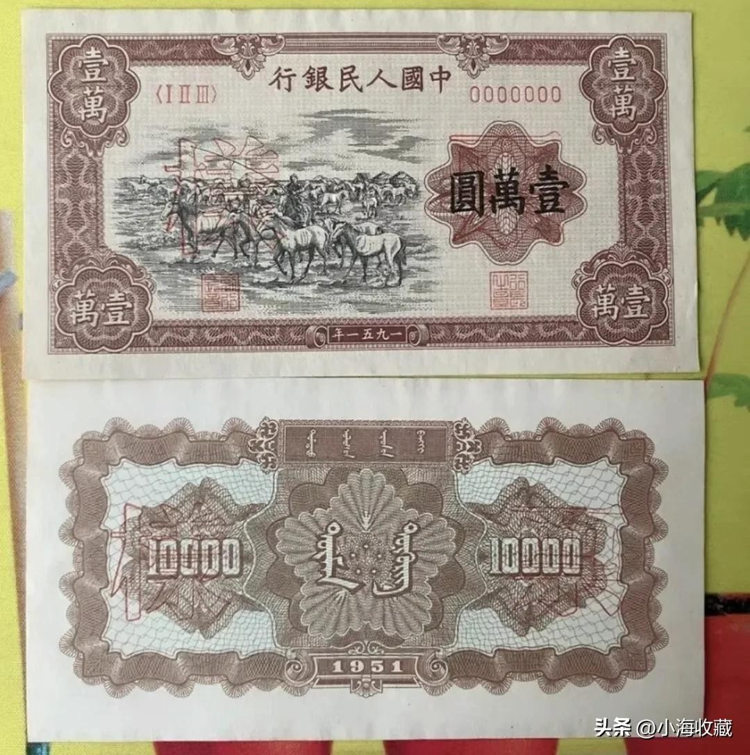 1951年发行的木马图,面值1万元,是迄今为止发行最大面值的人民币,也是史上收藏价值最高的一张人民币。它的收藏价值在500万元。