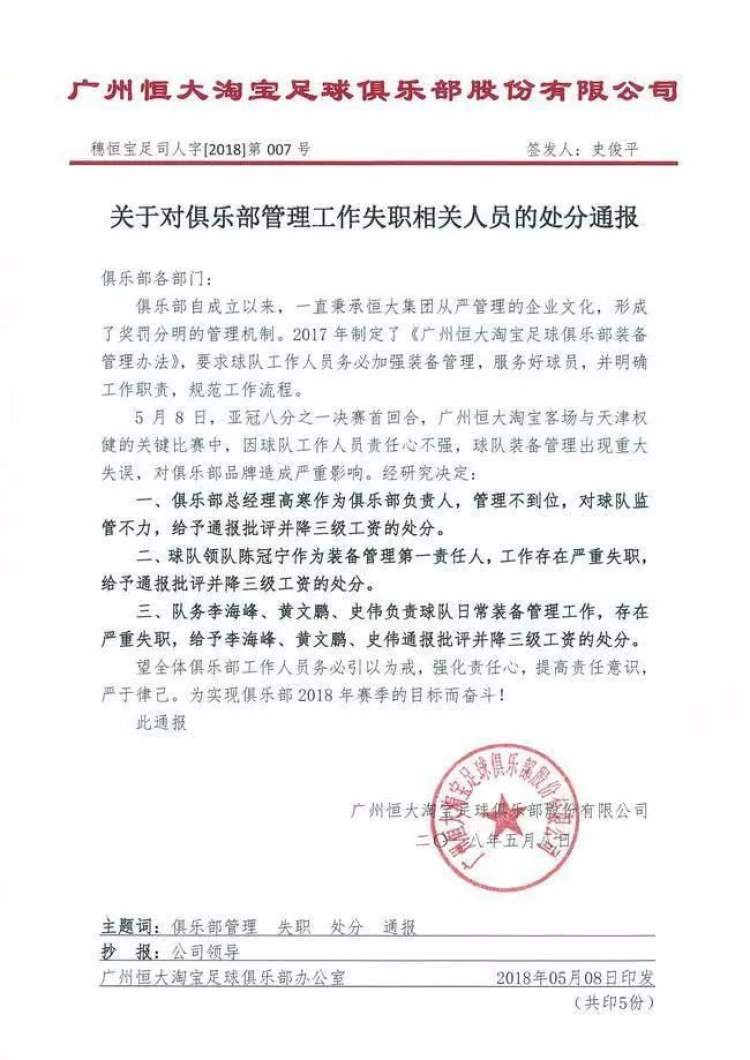 在赛后,由于球队保障工作方面的问题,恒大多名管理层及工作人员遭到处罚。