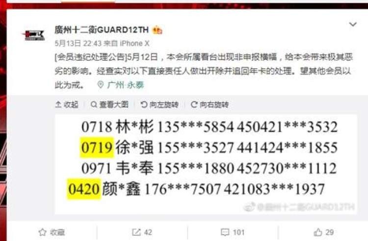 昨天,名为“广州十二卫”的球迷会在微博上公布了对4位涉事球迷的处罚:“5月12日,本会所属看台出现非申报横幅,给本会带来极其恶劣的影响。经查实对以下直接责任人做出开除并追回年卡的处理。望其他会员以此为戒。”微博配图中公布了4人的会员号、部分姓名、部分手机号以及部分身份证号码。