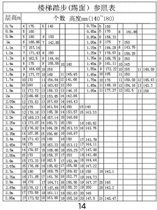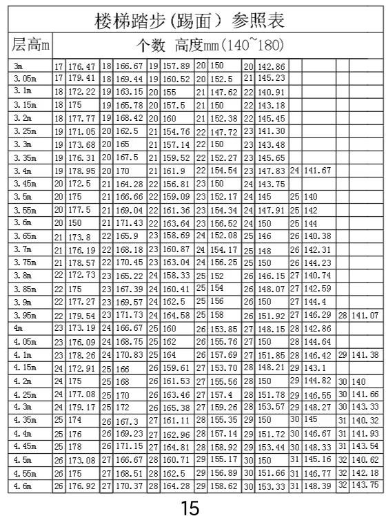 楼梯踏步参照表,层高三米至4米6。