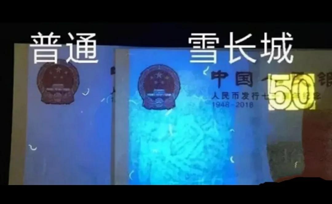 2、雪长城是纪念钞正面水印部分的荧光原因造成的,存在强弱问题,比较难区分。