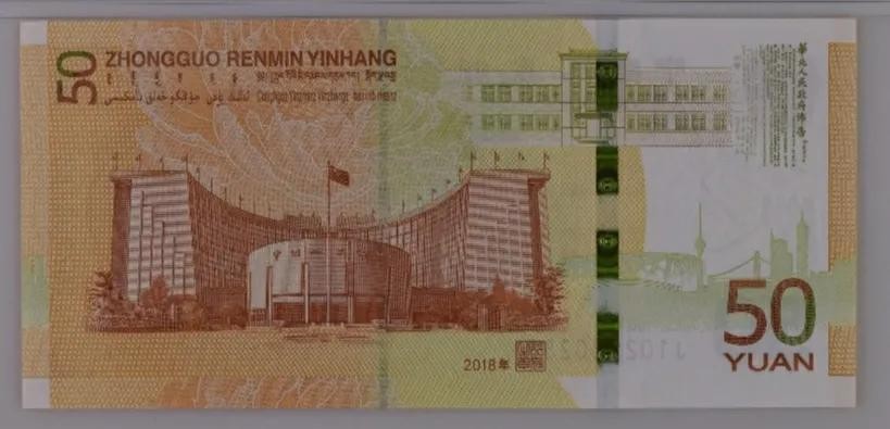 人民币发行70周年纪念钞背面主景图案为中国人民银行大楼,辅以牡丹花、中国人民银行旧址、第一套人民币发行布告及城市建筑剪影图案。票面左上角为面额数字“50”,中国人民银行汉语拼音字母和蒙、藏、维、壮四种民族文字的“中国人民银行”字样与面额。票面下方为行长章与年号文字“2018年”。票面右下角为面额数字“50”,汉语拼音字母“YUAN”。