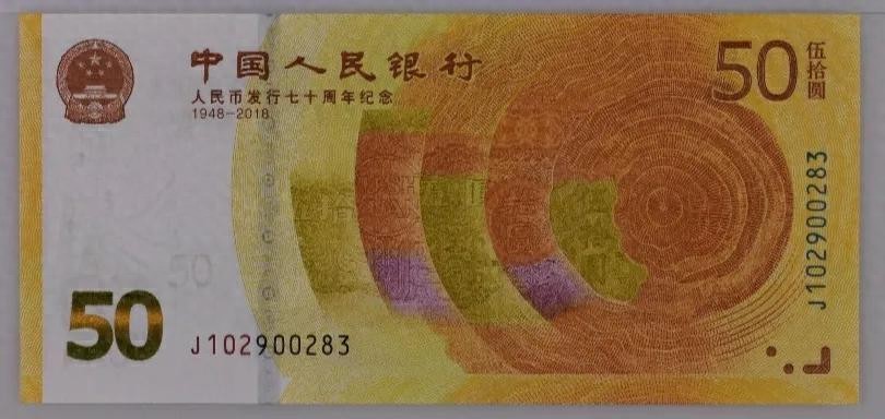 人民币发行70周年纪念钞正面主景图案为树木年轮与第一套至第五套人民币代表性局部图案。左上方为中华人民共和国国徽图案、“中国人民银行”行名,其下为“人民币发行七十周年纪念”与“1948-2018”文字。票面左下方为面额数字“50”,右上方为面额数字“50”与汉字“伍拾圆”。