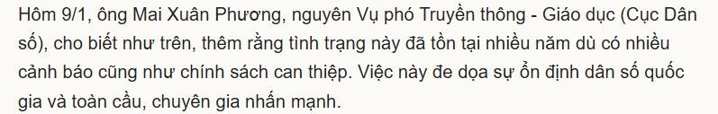 根据方先生的说法,许多越南人在出生率急剧下降的情况下仍然对男孩抱有偏见,每个女人只有1.91个孩子,而理想的数字是2,1。许多家庭只生一个孩子,就千方百计地选择胎儿的性别。