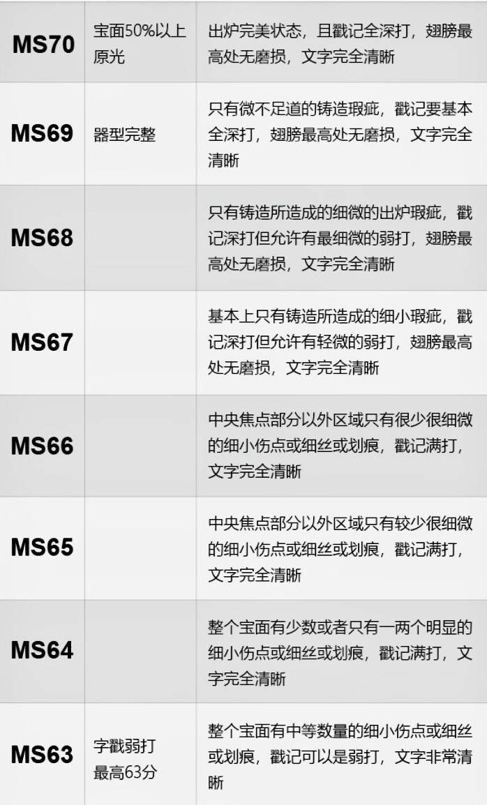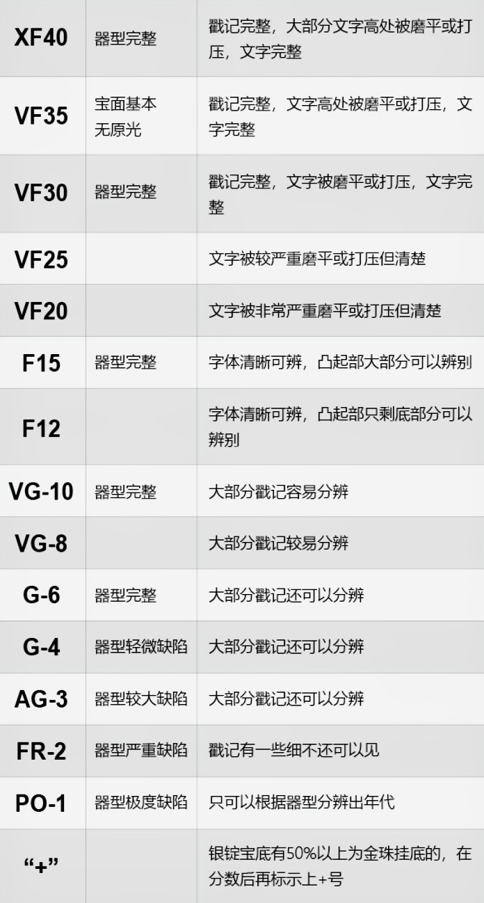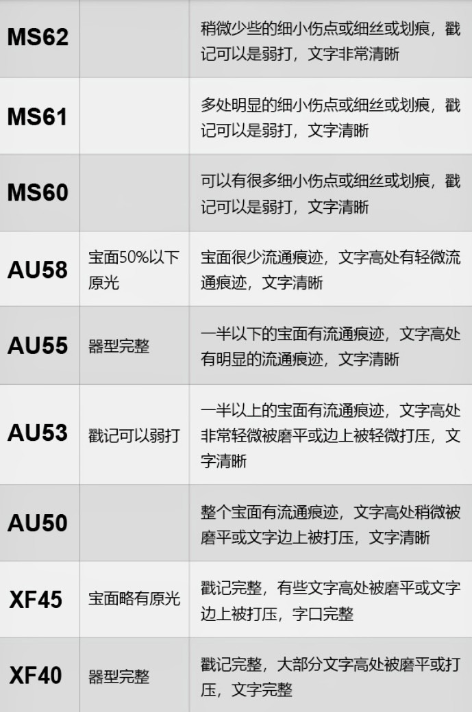 注:1、元宝根据其宝面的状态先行定级为UNC、AU、XF、VF、F状态
