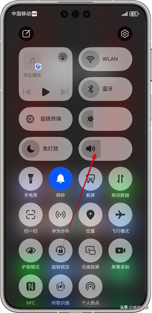 打开华为手机的控制中心,在这里也可以调节声音大小。控制中心主页会显示一个音量框,左右滑动就可以调高或调低手机声音,当然,这个和手机音量键相同,只能在不同的场景下调节对应的声音大小。