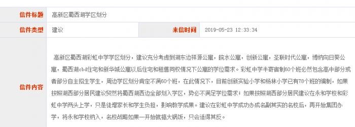 安徽网、大皖客户端讯 近日,有网友在合肥“12345政府服务直通车”留言,咨询高新区蜀西湖彩虹中学学区划分情况。
