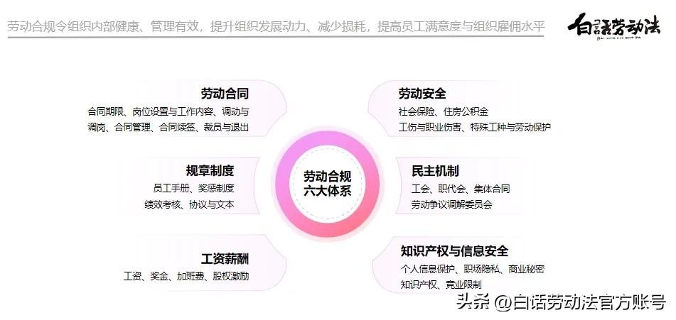 【白话劳动法】以“劳动法+“、”雇佣能力”的方法论,从源头帮企业搭建合规的人力资源配置模型,针对不同行业不同企业发展中的各类劳动问题,提供精准的管理解决方案,提升员工满意度和雇主品牌形象。