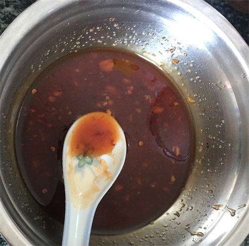 调汁:以这个汤匙为准,两勺甜辣酱,一勺冰梅酱(番茄酱也可以),两勺白糖,一勺生抽,三勺香醋,味精少许,胡椒粉少许,调匀。