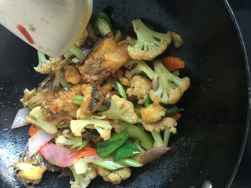热锅冷油,待油温升高时把所有配菜下锅翻炒,倒入调好的汁,最后倒入炸好的鱼块翻炒下就可以起锅了。我只把鱼块放一半进去炒了,剩的一半我在上面撒了椒盐粉就上桌了。所以一条鱼我做了两道菜。