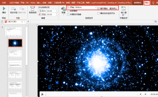 再接下来,就是进行播放设置了,选中视频,点击【播放】,然后将开始选择【自动】,勾选【循环播放,直到停止】。