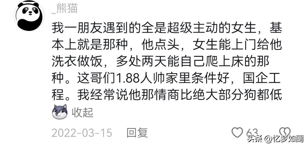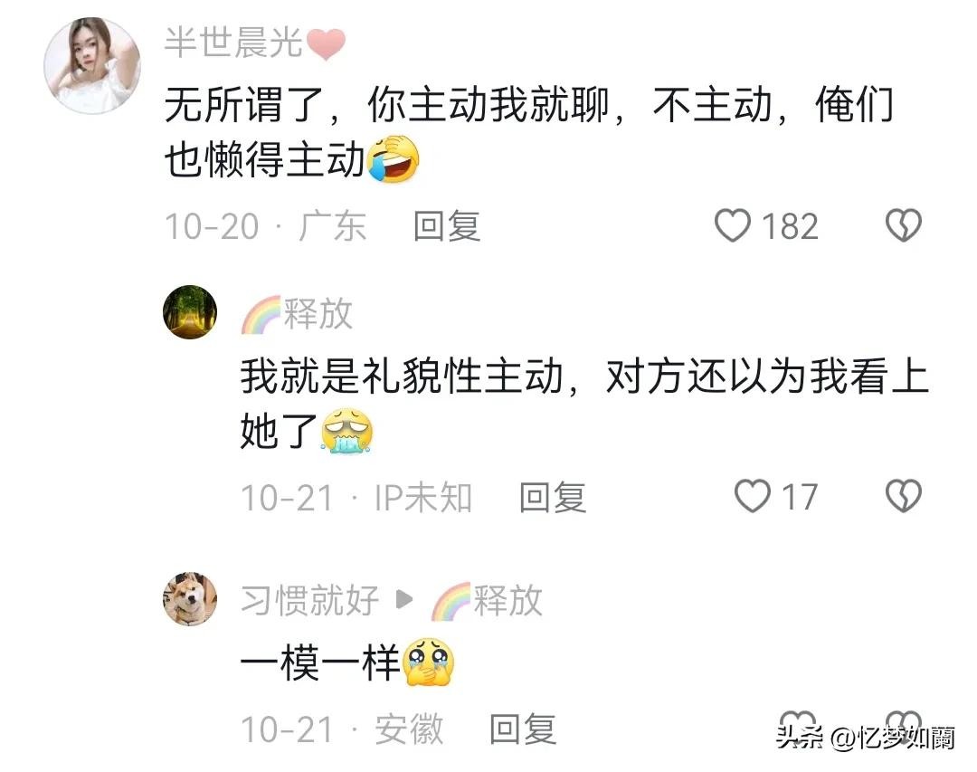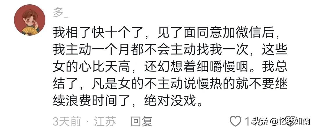 我相了快十个了,见了面同意加微信后,我主动一个月都不会主动找我一次,这些女的心比天高,还幻想着细嚼慢咽。我总结了,凡是女的不主动说慢热的就不要继续浪费时间了,绝对没戏。