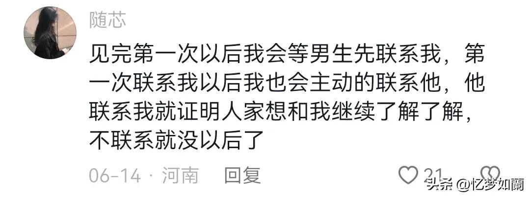见完第一次以后我会等男生先联系我,第一次联系我以后我也会主动的联系他,他联系我就证明人家想和我继续了解了解,不联系就没以后了。