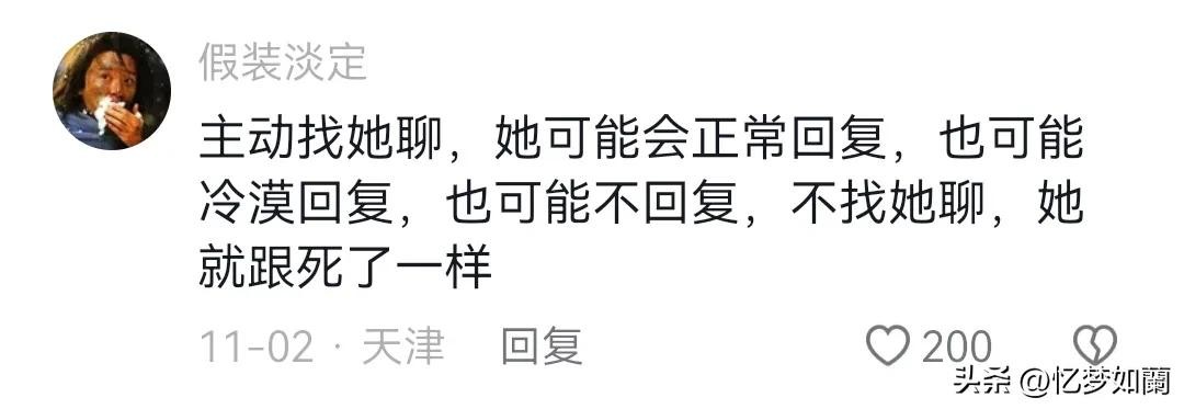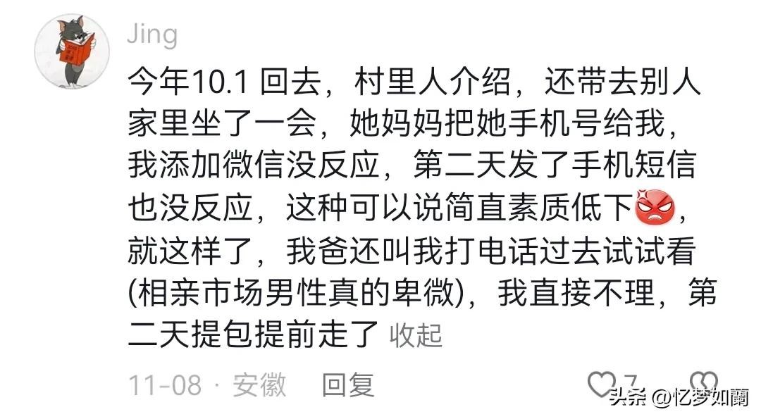 这种就不要去接触了,不要留恋,快速转移,又不是谈恋爱的,相亲都跟买商品一样的,真的愿意处对象的都是双向奔赴的,越是舔,她越姿态越高。