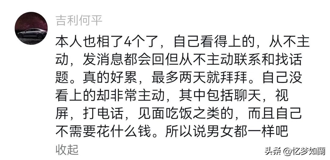本人也相了4个了,自己看得上的,从不主动,发消息都会回但从不主动联系和找话题。真的好累。