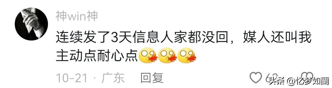连续发了3天信息人家都没回,媒人还叫我主动点耐心点。