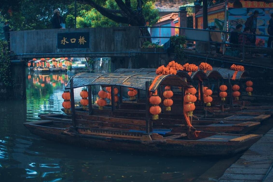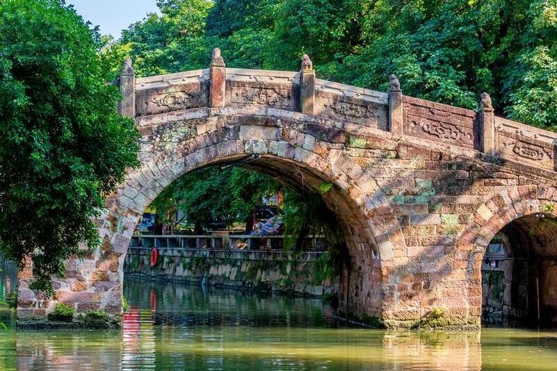 在逢简水乡,最吸引人的当然是明远桥了。这座建于宋朝的红砂岩桥梁,是中国现存文献记录中最早的三孔石桥之一。桥上刻有各种图案,两侧的石狮子和彩陶装饰更是让人称赞不已。桥下的河水清澈见底,映衬着桥上的美景,别有一番风味。