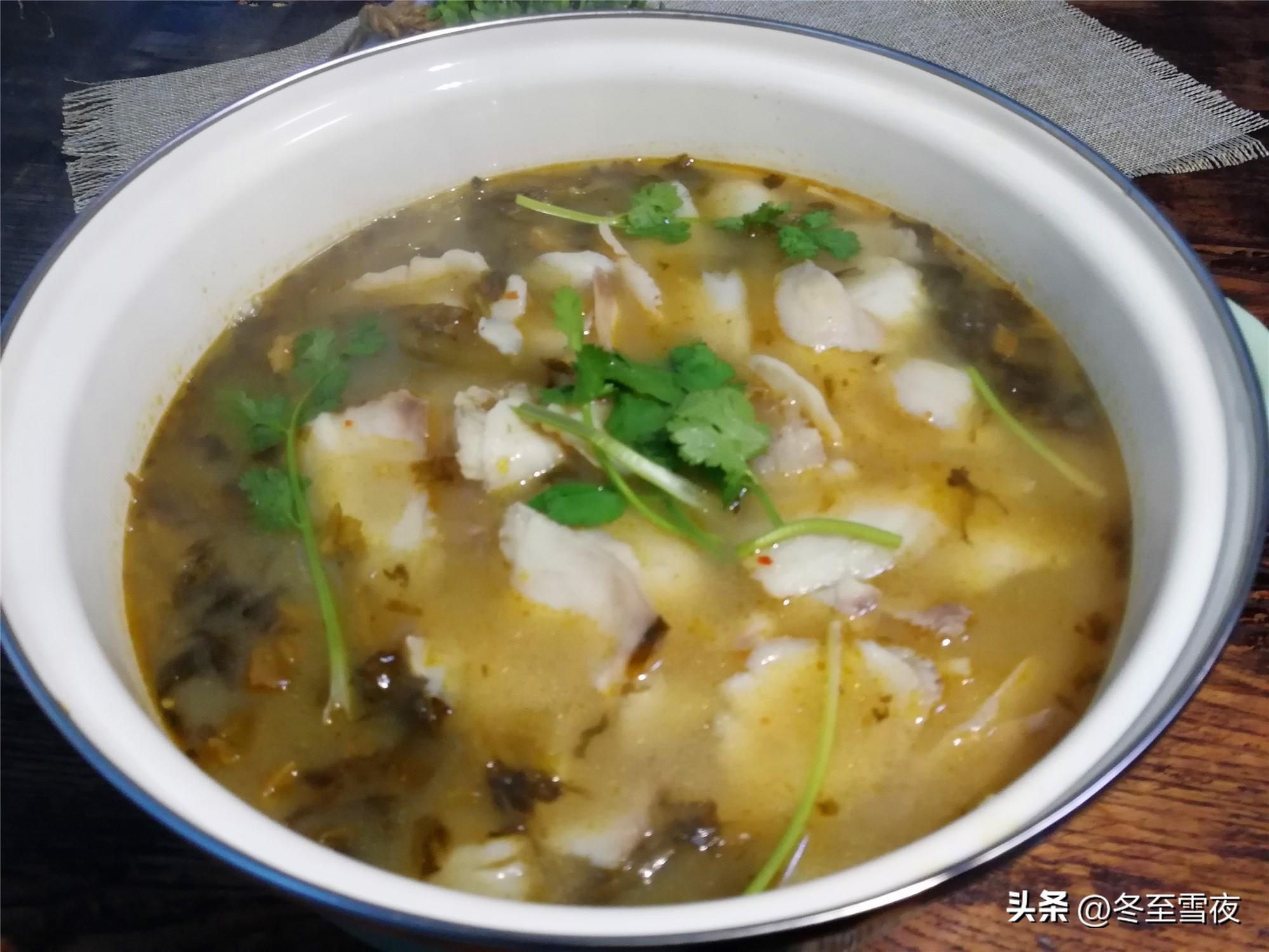 10.把鱼片和汤一起倒在酸菜上,放上香菜段即可,一道美味的酸菜鱼就做好了。