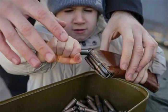 一个乌克兰小男孩努力从弹夹中取出弹药,