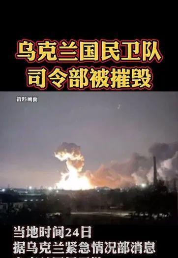 乌克兰国民卫队司令部被炸毁,浓烟密布,火光照亮天际。