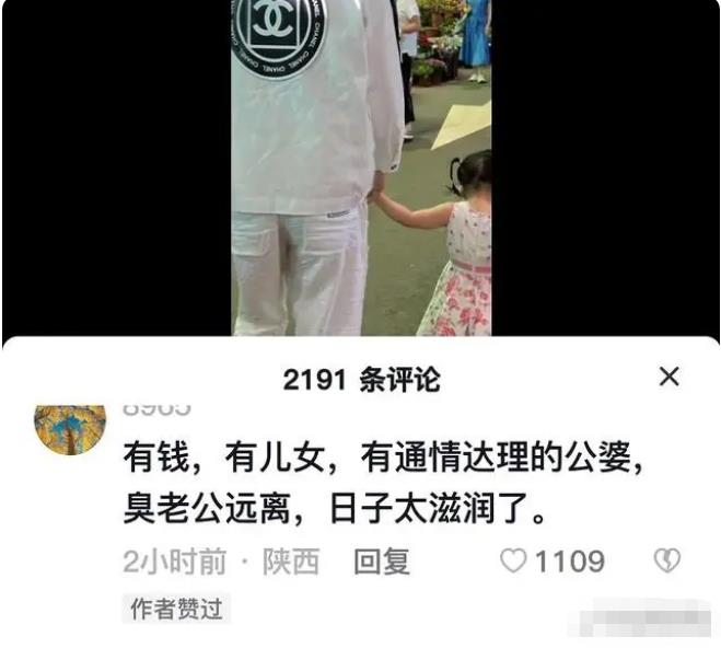 这还不算什么,还有人总结得更加精辟,称:“有钱,有儿女,有通情达理的公婆,臭老公远离,日子太滋润了。”