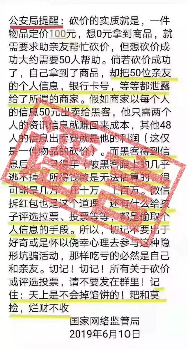 最近,一张以公安局开头,署名为国家网络监管局的图片在微信朋友圈中广为流传。图片大意是说在微信中关于砍价、投票等形式的营销活动都不要参加,因为会泄露个人信息、银行卡号等。