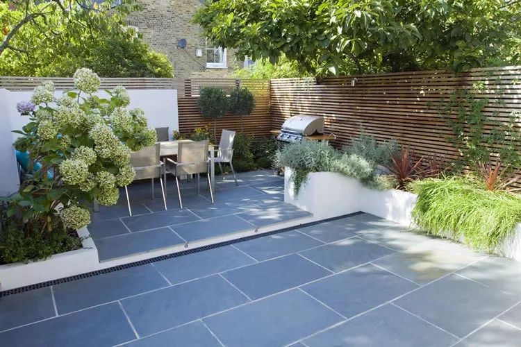 条形木栅栏和深灰色瓷砖地面完美搭配,角落种上绣球和长青植物,来一场欢乐的BBQ派对吧!