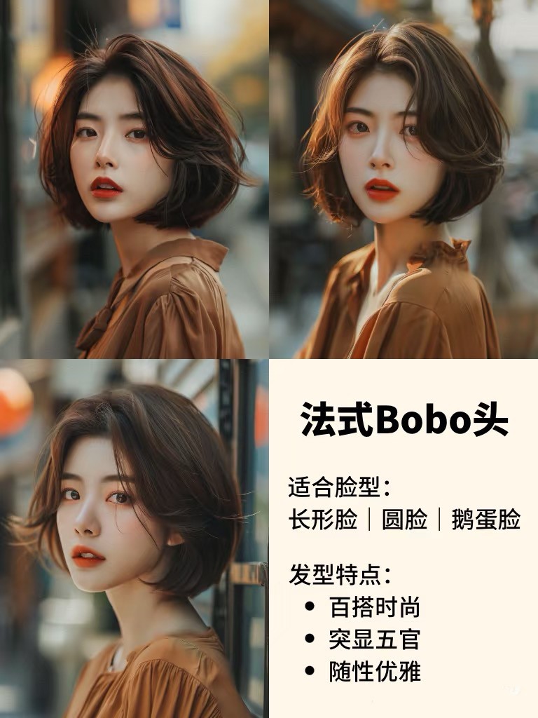 这种发型,适合比较大气的五官长相。圆脸、国字脸、鹅蛋脸,都可以尝试经典的bobo头造型。