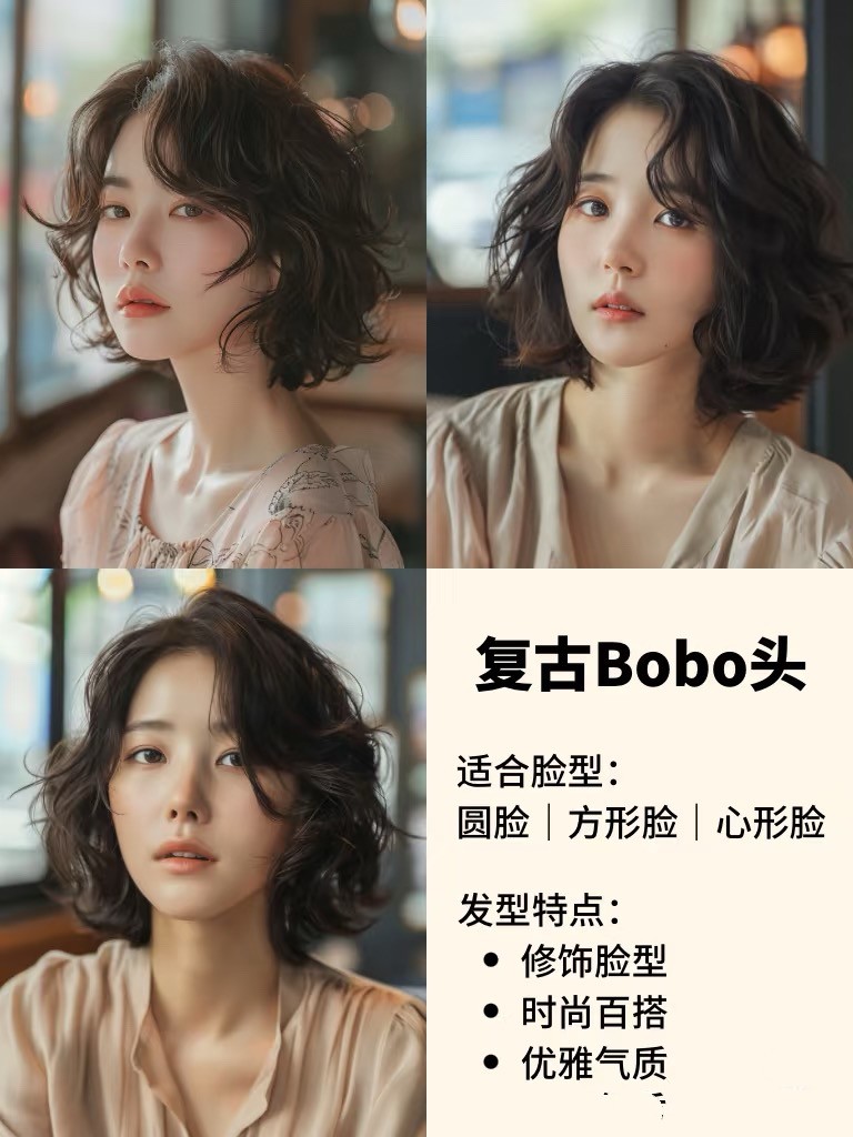 一种是时尚百搭的bobo头,可以更好的优化五官棱角线条,表现出更优雅的气质。这种复古风bobo头,太适合圆脸、方形脸和心形脸了。