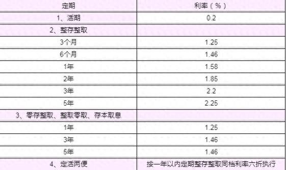 整存整取的定期存款年利率为1.25%~2.25%,其中三个月期为1.25%,六个月期为1.46%,一年期为1.58%,二年期为1.85%,三年期为2.2%,五年期为2.25%