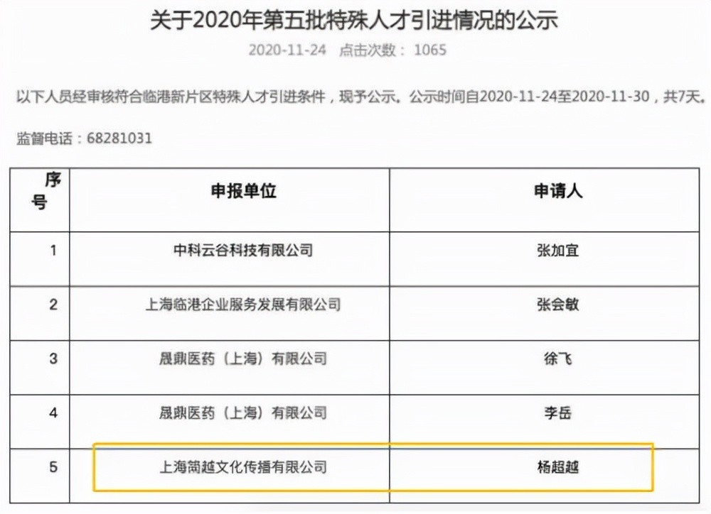 2020年11月24日,上海临港新片区公示了特殊人才引进名单,一个大众熟悉的名字赫然在列——杨超越。