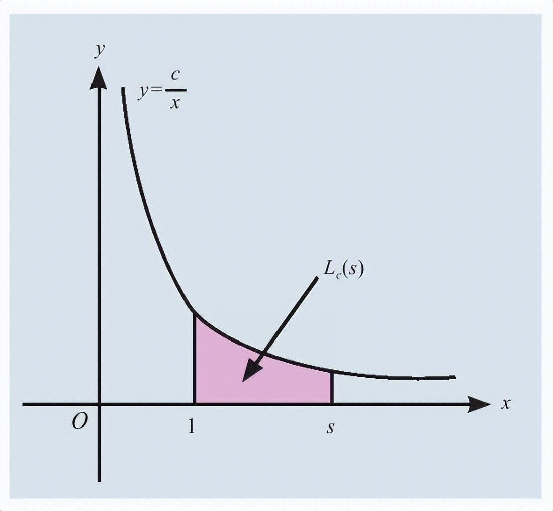 设s 为任意一个正数,并把图中阴影部分的面积记为Lc(s) 。我们约定,当s =1时,这个面积为0;当s >1时,其面积为正;而当s <1时,其面积为负。在这种约定下,函数Lc(s)就是一个对数函数。