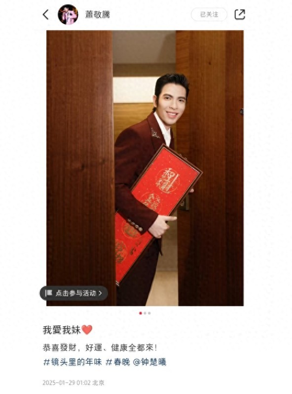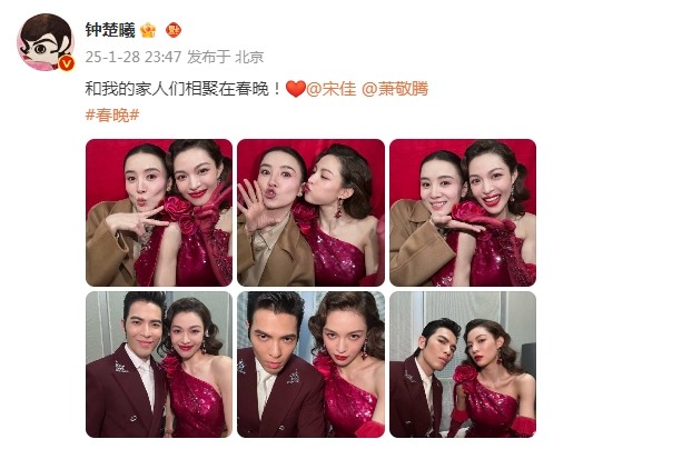 而在除夕夜当晚(1月28日晚),钟楚曦就晒出了好几张和萧敬腾的合影,并写道:“和我的家人们相聚在春晚”,好心情一览无余。