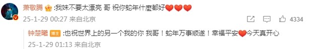 看到钟楚曦的晒照和发文后,萧敬腾现身评论区并写道:“我妹不要太漂亮,哥祝你蛇年什么都好”。钟楚曦也暖心回应:“也祝世界上的另一个我的你,我哥,蛇年万事顺遂,幸福平安,今天真开心”,真是隔着屏幕都被钟楚曦的喜悦心情给感染到了。