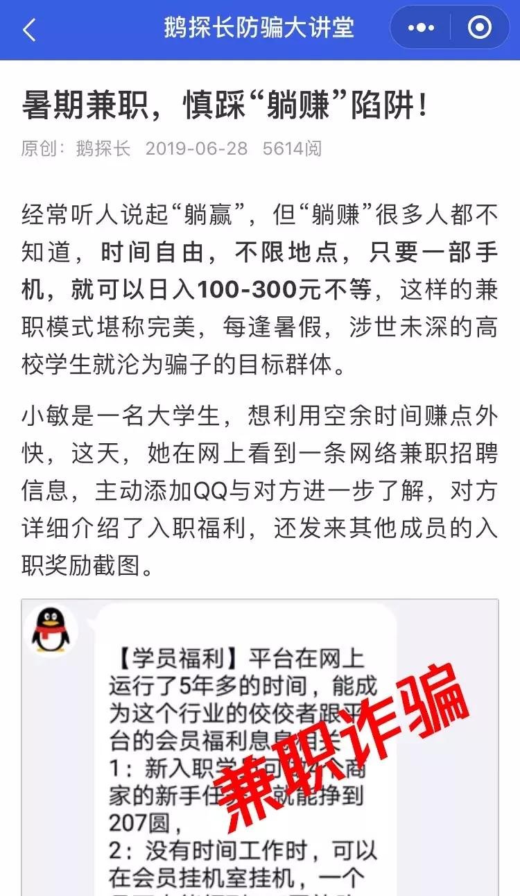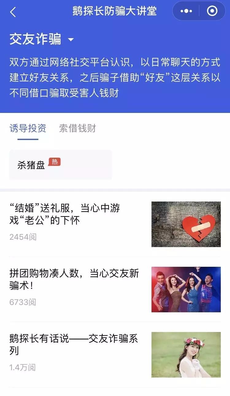 鹅探长防骗大讲堂:结合用户真实举报案例,持续更新全网最新、最热门的诈骗手法解析,内容覆盖交易诈骗、兼职诈骗、交友诈骗等,帮助用户了解防骗套路,提高防范意识。
