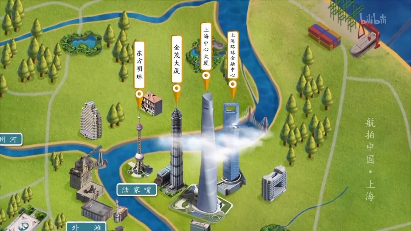 陆家嘴90度弯道:东方明珠、金茂大厦、上海中心大厦、秦皇岛路渡口码头轮渡1976年。东方明珠资格最老,传播电视信号造价八亿元,当时属于世界第三高。它的灯光蓝白光常见,粉色是节假日亮。