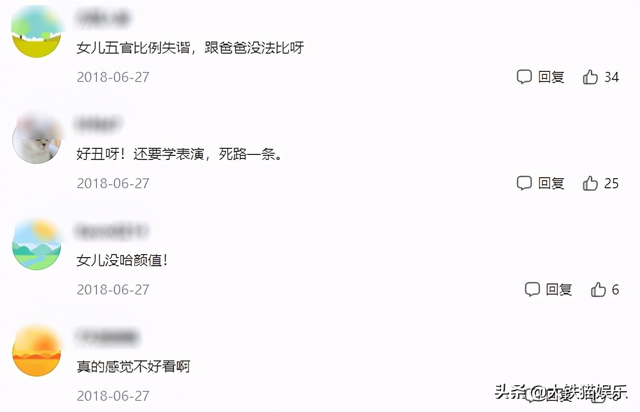 早前有媒体宣传她时,不少人抨击她的颜值,觉得她没有遗传到父母的优良基因,颜值在娱乐圈里只能算中下,直言她学表演是死路一条。
