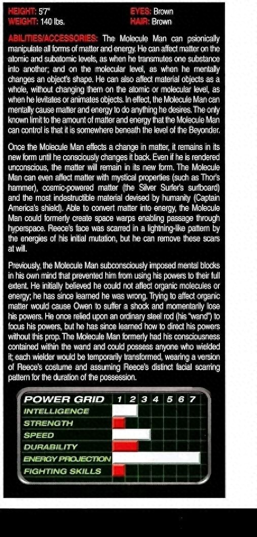 一旦分子人改变了物质,就会保持新的形态,直到他有意识地把它变回来。即使他失去知觉,事情仍将以新的形式存在。分子人甚至可以影响具有神秘属性的物质(如雷神之锤)、宇宙动力物质(银色滑行者的冲浪板)和人类设计的最坚不可摧的材料(美国队长的盾牌)。能够将物质转化为能量,分子人以前可以创造空间扭曲,使穿越超空间成为可能。欧文的脸上有一道闪电般的疤痕这是他最初突变的能量造成的,但他可以随意去除这些疤痕。