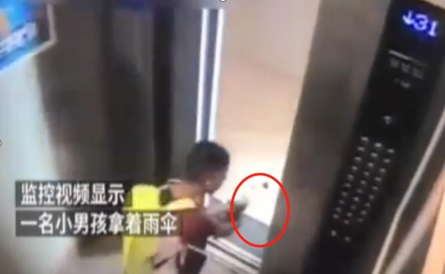 熊孩子用雨伞反复阻挡电梯关门,雨伞被电梯夹住,男孩被困电梯内