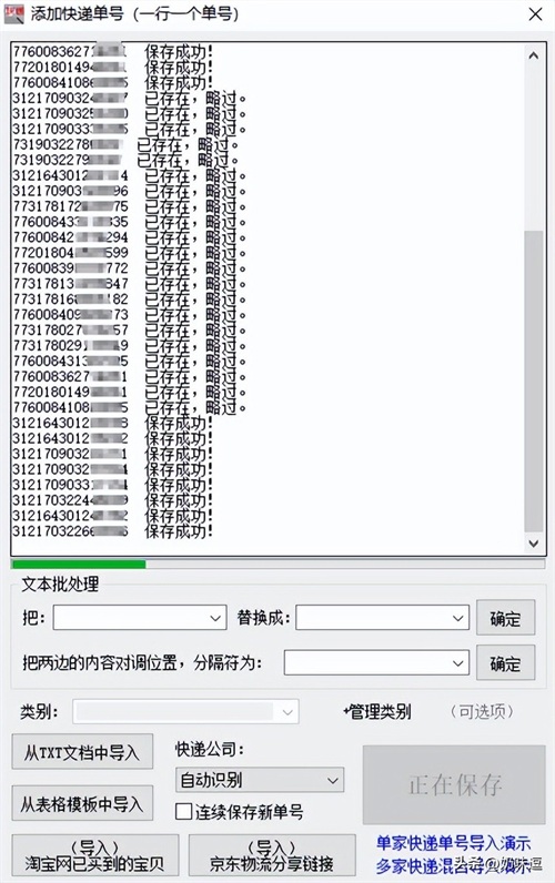 在保存过程中,不仅能自动识别快递公司,还可自动过滤重复的单号,非常方便