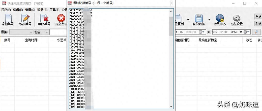 运行【快递批量查询高手】,在“添加单号”中,我们可以将准备好的快递单号复制粘贴进去,一行一个